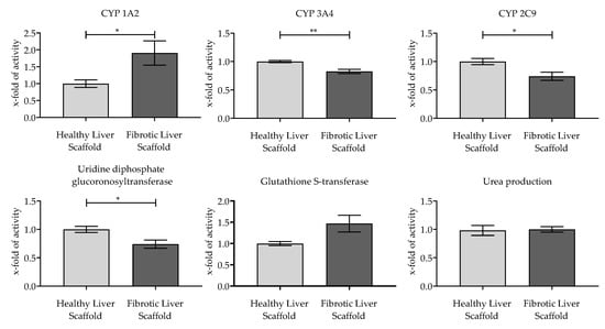 Metabolic activity of HepG2 cells plated on the two scaffolds. The activity of phase I enzymes CYP 1A2, CYP 3A4, and CYP 2C9, and phase II enzymes, UGT and GST, was measured. The detoxification of ammonia was quantified by measuring the urea production. Values are shown as multiples of the activity of cells plated on the healthy liver scaffold, N = 3, n = 3; bars represent mean ± SEM; *p < 0.05, **p < 0.01 as indicated.