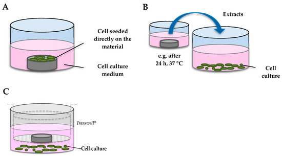 Schematic representation of in vitro cytotoxicity tests. (A) direct-contact test; (B) indirect contact assay; (C) exposure to soluble components through a Transwell® insert.