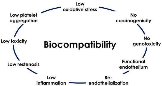 Biocompatibility is even more complex to define in vivo than in vitro. As illustrated in Figure 2, it is a combination of low classical adverse effects of permanent material, i.e., restenosis or thrombosis, but also low inflammation, toxicity and oxidative stress. Moreover, as other metals like arsenic, cobalt, chromium and nickel are known to be carcinogens, it is suitable to test the carcinogenicity of biodegradable materials [30]. Assessment of the genotoxic activity of the material is equally relevant in order to avoid alterations in DNA or chromosomal structure or other DNA or gene damage that results in permanent changes in cell function and ultimately carcinogenesis [63]. Finally, the reformation of a complete and functional endothelium is indispensable after the implantation. A new endothelium starts to be formed immediately after stenting (in vivo studies showed a neoendothelium after one week of implantation [59]), but regenerated cells have to be healthy. A functional endothelium is key to preventing neoatherosclerosis and previous studies on drug-eluting stents revealed a functionally incompetent regenerated endothelium [64]. Additionally, optimal blood compatibility can only be achieved by a monolayer of normal endothelial cells [65].