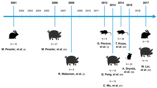 Timeline of in vivo Fe-based materials implantations. N represents the number of animals use.