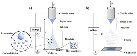 Electrohydrodynamic atomization (EHDA) is an interdisciplinary field and a subfield of fluid mechanics dealing with the effects of applied electrical forces on liquids [17,18]. Processes proceed by applying an electrical charge to a viscous liquid through a capillary nozzle, leading to the formation of droplets and further atomizing particles to possess varying sizes from hundreds of micrometers (μm) to several tens of nanometers (nm). This process which mainly contains an emitter and an electrode sustained at different electrical potential provides almost a monodispersed distribution of particles. ES is considered a part of EHDA [17,19]. Generally, ES consists of components such as a high voltage source, a syringe pump (SP), a spray head, and a collector [12,20,21]. ES proceeds by forcing a liquid through a capillary to a collector under a potential drop, on the order of kilovolts (kV), which is applied between the capillary and the collector [22]. Typically, a liquid of non-zero electrical conductivity is expelled through a low flow capillary (mL/h) and a high voltage difference (kV). As depicted in Figure 1, this is established between the capillary and a counter electrode arranged at a certain distance from the capillary in the manifold. A high voltage applied to the needle is passed into a polymer solution which is then ejected from the nozzle. When the polymer solution flows through the capillary, the droplet is highly electrified and distorted into a conical shape commonly known as a Taylor cone (Figure 1). After the solvents are evaporated during the course of the jet spray, the generated electrospun polymeric materials are collected on or in a grounded collector [21]. Here, in the ES technique, the main aspect consists on the deformation of the liquid flow at the emitter output, in the case of the needle tip, acquiring a conical structure (Taylor cone), due to EHDA interactions, as shown in Figure 1 [17,23,24]. Figure 1 also demonstrates the difference between the ES and Electrospinning (ESP) techniques, where ES is a variant of the method of ESP, which began in medicine with an aim to easily and quickly encapsulate drugs (Figure 1b) [25]. The basic difference between these technologies is the concentration of the polymer used and the molecular weight, i.e., when high polymer concentrations are employed, there is a tendency for yarn to be formed (Figure 1b), and for lower polymer concentrations, particle formation can be observed [15].