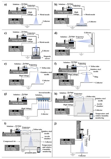 In this section, the different types of ES configurations, i.e., equipment and objects (e.g., infusion pump, needles, and syringes etc.), employed will be covered. The different types of configurations and setups for the ES technology are summarized in Figure 2. The simplest setup is depicted in Figure 2a, which consists of a syringe pump connected to a capillary further connected to a high voltage source and a manifold to collect the MPs. This simple setting requires only a few pieces of equipment and apparatuses and, therefore, is an attractive and cheap option.