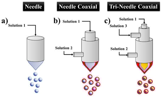 In the monoaxial ES there are three types of needles used to design MPs. Figure 3a shows a simple needle while Figure 3b illustrates a coaxial needle which has another needle on it. Moreover, Figure 3c shows a tri-coaxial needle, which has three needles with one on the outer part, one needle in the middle part, and another needle in the inner part.