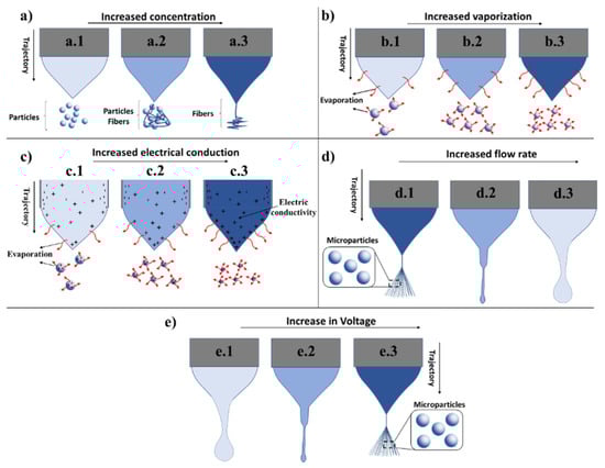 According to previous reports, the importance of the parameters for mass and volume during the preparation of the polymer solution for the ES are eminent for the final products, and in general, a ratio between 2% and 10% (w/v) are recommended for obtaining MPs [10,12,20,39,40,55]. Within this framework, Figure 4a illustrates how the concentration of the polymer would impact the outcome of the ES process and generate products, where low polymer concentrations (well-diluted solutions) would provide MPs (Figure 4(a.1)). In the case of higher polymer concentrations providing higher viscosity (solution concentrations at 10% (w/v)), sufficient surface tension favoring the entanglement of the polymer chain and favoring the formation of fibers between the MPs would result (Figure 4(a.2)) [10]. In the case of higher concentrations (higher than 10% (w/v)), the formation of fibers is favored as illustrated in Figure 4(a.3). In all the scenarios presented, the solutions are composed of only the polymer and the solvent and, therefore, in the absence of any dopants or charge to impact the fabrication of the particles, these will be discussed in the following sections.