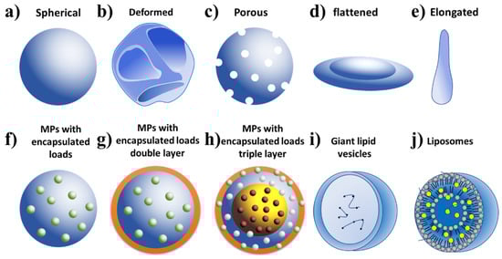 The different types of MPs generated from the ES technology: (a) spherical, (b) deformed, (c) porous, (d) flattened, (e) elongated, (f) MPs with encapsulated loads, (g) MPs with encapsulated loads with double layers, (h) MPs with encapsulated loads with triple layers, (i) giant lipid vesicles, and (j) liposomes.