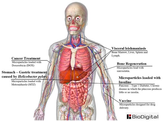 Suksamran et al. prepared calcium-alginate and calcium-yam-alginate MPs coated with chitosan (TM65CM50CS) by the ES technique in which ovalbumin (OVA) was used as an antigen model to induce immune responses in mice after oral vaccination [37]. The MPs were prepared by dissolving the alginate or alginate-yam and CaCl2 powder separately in water under magnetic stirring in order to obtain solutions of 1% (w/v) alginate and 4% (w/v) CaCl2. Subsequently, solutions containing various ratios between alginate and OVA (10%, 20%, and 40% w/w) were prepared. Next, the MPs were produced by placing the solutions (10 mL) in syringes and extruding them, using a needle with and internal needle diameter of 0.9 mm, into a solution containing 150 mL of CaCl2 solution (4% w/v). The voltage applied was 18 kV, the distance between the needle tip and collector was adjusted to 30 cm, and flow maintained at 1 mL/h [37]. The obtained OVA MPs loaded with calcium alginate (OVA-MP) and OVA MPs loaded on Ca-alginate-yam (OVA-YMP), were further coated with modified chitosan (TM65CM50CS) (CS-OVA-YMP and CS-OVA-MP). The MPs were obtained as a spherical shape with a diameter of 1.49 ± 0.11 (CS-OVA-MP) and 2.96 ± 0.23 μm (CS-OVA-YMP), respectively. Further cytotoxicity investigation confirmed the safety of the MPs and the overall study demonstrated the potential of the material as a vital candidate for the transport of vaccines and at the same time improving the immunogenicity of oral vaccines [37]. Additionally, MPs based on poly disulfide polyether urethane (PEU) as the core and PEG as the shell have been fabricated through CES [48]. Subsequent removal of the PEG provided a spherical morphology with an average diameter of 100 nm and could further successfully encapsulate the anticancer drug doxorubicin (DOX). The various parameters employed for the fabrication of the MPs were the following: using the solvent trifluoroethanol (TFE), polymer concentrations of the core (3%, 4%, and 5%) and the shell (10%), FR of 0.3 and 0.5 mL/h (core) and 1 mL/h (shell), a collector distance 17 cm, an applied voltage −11.06 kV, a temperature 25 ± 5 °C, and the RH was 30 ± 5% [48]. The designed MPs were aimed to be used in the treatment of Leishmaniasis affecting the bone marrow, liver, spleen, and lymph glands (Figure 6). In this context, according to the Centers for Disease Control (CDC), 90% of visceral leishmaniasis are untreated and result in mortality and therefore improved materials are badly needed to treat such diseases [34].
