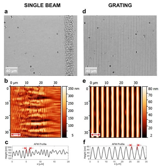 Optical and AFM images—panels (d–e), respectively—of the grating substrate (see Materials and Methods) showed a periodic surface modulation, which was homogeneously extended in the whole illuminated area of about 4 mm in diameter. The SRGs had a wavevector oriented along the polarization direction (red arrow in Figure 2e) of the two laser beams used to produce the illuminating interferogram. The grating periodicity measured from AFM profile—as shown in panel (f)—was , while the amplitude modulation was .