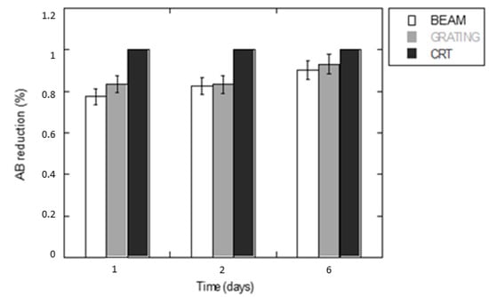 The spatial organization and the spatial extent of the grooves in the azopolymer substrates influences the cell interaction due to the capability of the cells to bind adhesive molecules to the substrate []. Before investigating the substrate-induced structural features of the cells, Alamar Blue® (AB) assay was used to evaluate the hMSCs’ viability and proliferation until 6 days as an index of the biocompatibility of the azopolymer films and eventual differences in the patterned areas of the samples. Results in terms of AB percentage reduction are shown in Figure 3. Despite a signal decay with respect to the polystyrene culture plate, no significant reduction of hMSCs between micropatterned substrates was observed over the time.