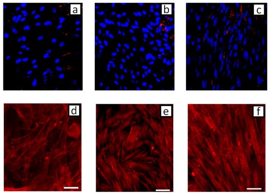 Fluorescently stained cellular nuclei (a–c) and actin filaments (d–f): confocal images of (a,d) unpatterned surface, (b,e) single beam and (c,f) grating samples.