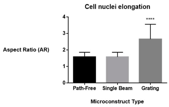 Aspect ratio of hMSCs nuclei on the unpatterned surface, single beam and grating. (**** p < 0.0001).