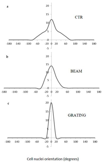 The quantitative determination of key adherent cell culture characteristics, such as confluence, morphology, and cell density, is necessary for the evaluation of experimental outcomes and to provide a suitable basis for the establishment of cell culture protocols []. After 5 days in culture, cell morphology was investigated by Confocal Microscopy (Leica SP8,Wetzlar, Germany) supported by Cage incubator (Okolab, Naples, Italy) onto different patterns (single beam, grating and path-free as control). In this case, cells were formalin-fixed and stained with phalloidin (Alexa-Fluor 594, Invitrogen) and 4′,6-diamidino-2-phenylindole (DAPI) according to the manufacturer’s instructions. The elongation and orientation of cells were estimated from nuclei and actin filament cells by image elaboration via NIH ImageJ (freeware, ver.1.41). In this case, images were preliminary converted to grayscale, and the threshold was adjusted to highlight all of the cell nuclei to count. Then, background subtraction and watershed were applied to obtain a binary mask []. Lastly, the ‘Analyze Particle’ plugin was used to best fit the cell nuclei to elliptical shapes. Major and minor axes lengths of the closest-fitting ellipse were associated to cell nuclei lengths and widths, respectively. Elongation, defined as the extent of cell nuclei stretch, was calculated as the relative major to minor axis ratio or Aspect Ratio (AR), while orientation referred to the nuclei alignment and was calculated as slope of the tangent line to the ellipse respect to x-axis. Hence, the angle distribution of cell nuclei was elaborated.