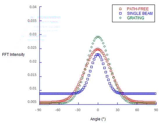 The surface modulation of the azopolymer films was achieved by illuminating the samples with linearly polarized light of an Ar+ cw laser (λ = 488 nm). Two different type of samples were prepared: the first one (named “single beam” sample) is characterized by the spontaneous surface reliefs gratings (SSRGs) resulting from the light-induced self-structuration of the azopolymer film during the illumination with a single slightly focused laser beam [,,,]. To achieve this surface modulation, a collimated laser beam was first expanded to a diameter of 3 mm before being focused onto the sample surface through a cylindrical lens (focal length f = 75 cm). The resulting laser spot in the sample plane had an elliptic profile, with minimum width of 30 µm and length of about 2 mm. The light polarization direction was controlled by a half-wave plate and chosen to be parallel to the short axis of the ellipsis. The laser power was maintained constant at 0.870 mW for 1 h of illumination.