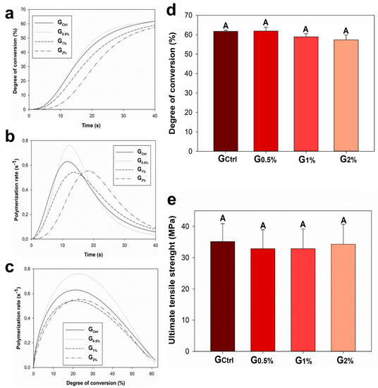 Comprehensive results of polymerization kinetics (a–c), degree of conversion after 40 s of photoactivation (d), and ultimate tensile strength (UTS) (e). Same capital letters indicate no statistical difference among groups (p > 0.05). The groups had different polymerization kinetics without statistical difference for the degree of conversion and UTS.