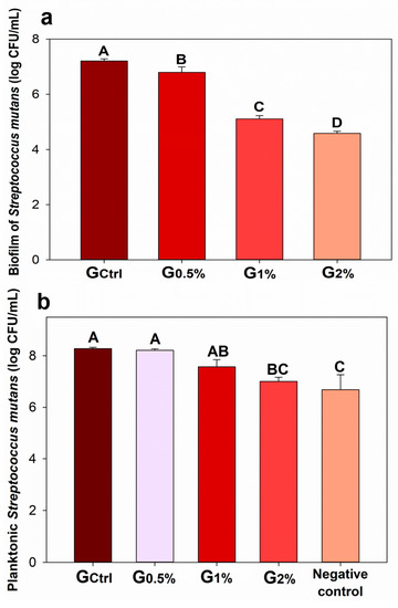 Bacterial colony forming unit counting: (a) Streptococcus mutans biofilms and (b) planktonic S. mutans that were in contact with the polymerized samples. Values indicated by different letters indicate statistical differences among the groups (p < 0.05).