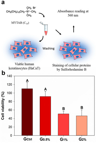 Cytotoxicity evaluation of the experimental dental resins expressed by percentage of cell viability: (a) structure of myristyltrimethylammonium bromide (MYTAB) and schematic drawing of sulforhodamine B (SRB) assay; and (b) MYTAB cytotoxicity assessed in normal human keratinocytes (HaCaT) line. Different capital letters indicate statistical differences among groups (p < 0.05).