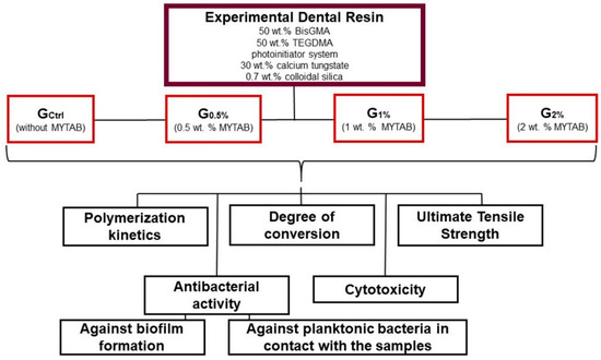 The study design is described in the flowchart presented in Figure 4. All reagents of the analytical grade for in vitro experiments were purchased from Sigma-Aldrich (Sigma-Aldrich Chemical Company, St. Louis, MO, USA) if not otherwise specified. First, a parental resin was formulated with two dimethacrylate monomers: bisphenol A glycol dimethacrylates (BisGMA) and triethylene glycol dimethacrylate (TEGDMA), at the proportion of 1:1. As a photoinitiator/co-initiator system, camphorquinone and ethyl 4-dimethylaminobenzoate were added to the resin at 1 mol % each. Butylated hydroxytoluene was added at 0.01 wt % as a polymerization inhibitor. Calcium tungstate (CaWO4) was added as inorganic filler at 30 wt %. Colloidal silicon dioxide (SiO2; Aerosil 200, Evonik, Essen, Germany) was incorporated at 0.7 wt % to adjust the resin’s viscosity. After being hand-mixed for 5 min, they were sonicated for 180 s and hand-mixed for 5 min.