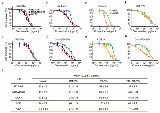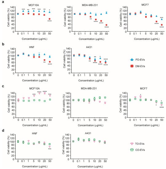 3.3. Cytotoxic Effects of EVs against Various Cell Types