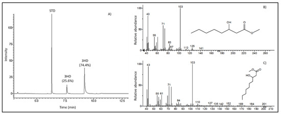 Gas chromatography–mass spectrometry (GC–MS) data of the PHA copolymer produced with sugarcane molasses as the carbon source: (A) Gas chromatogram, (B) Mass spectrum of a peak with Rt = 7.7 min identified using the National Institute of Standards and Technology (NIST) library as methyl ester of 3-hydroxyoctanoic acid, and (C) mass spectrum of a peak with Rt = 9.2 min identified using NIST library as methyl ester of 3-hydroxydecanoic acid. Methyl benzoate was used as an internal standard (STD).