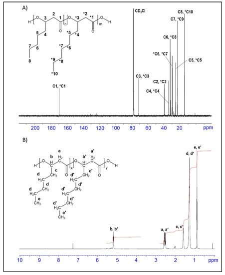 In order to confirm the structure of synthesised PHA, NMR analysis has been performed. 1H and 13C NMR spectra are presented in Figure 3. All peaks expected for P(3HO-co-3HD) where observed in 1H and 13C NMR spectroscopy. The chemical shift at 169, 70.9, 39.1 ppm corresponds to C1 (C=O), C3 (–CH), C2 (–CH2) respectively, forming the backbone of the copolymer. The resonance in the range between 23–35 ppm related to olefinic methylene groups: C4,*C4 (33.86, 33.92 ppm), C5, *C5 (24.84, 25.20 ppm), C6,*C6 (31.64, 29.48 ppm), C7,*C7 (22.63, 29.32 ppm), *C8 (31.91 ppm), *C9 (22.76 ppm) (carbon atoms of 3-hydroxydecanoate market with asterisk). The terminal methyl groups (–CH3) of C8, *C10 were observed at 14.12 and 14.22 ppm, respectively. All observed peaks in the 13C spectrum (Figure 3A) are in agreement with spectral characteristic reported for 3-hydroxyoctanoate and 3-hydroxydecanoate [30].