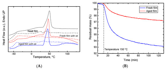 Thermal analysis of P(3HO-co-3HD) neat film and films with incorporated lime oil. (A) Differential scanning calorimetry (DSC) thermograms: neat film (black lines), fresh film with lime oil (red lines), and aged films with lime oil (blue lines). First heating—solid line, second heating—dashed line. Thermograms were shifted vertically for better visibility. (B) Thermogravimetric analysis (TGA) curves for determination of oil content after isothermal evaporation at 150 °C for 2 h.