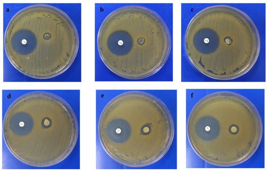 Halo test showing the antibacterial activity of aged lime oil containing P(3HO-co-3HD) films (a–c) and fresh lime oil containing films (d–f) against S. aureus 6538P (control: antibiotic disc containing 1 µg of oxacillin, left hand side).