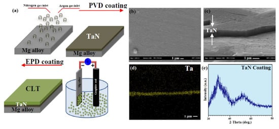 (a) Schematic demonstration of TaN-CLT-coated Mg alloy using PVD followed by EDP methods, (b) TaN coating, (c) cross sectional FESEM image of TaN coating, (d) EDS map of Ta and XRD patterns of (e) TaN coating and (f) CLT powder and CLT coating.