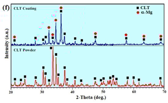The XRD pattern of synthesized powder revealed the formation of CLT (JCPDS No. 35-0610) without the presence of impurities such as protoenstatite (Figure 1f). The crystallite size of the synthesized CLT powder was 67 nm based on the Williamson–Hall method. However, the XRD pattern of the deposited film portrayed the formation of two obvious peaks α-Mg and CLT (MgSiO3) phases.