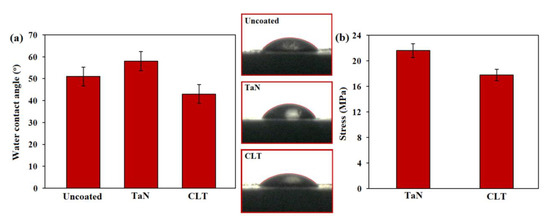 (a) Images of water contact angle of Mg bare alloy, TaN coated and CLT coated and (b) bond strengths of TaN coated and CLT coated Mg alloy.