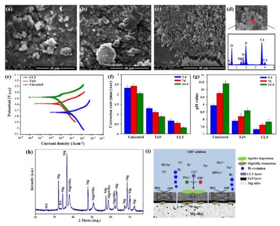 SEM micrograph of (a) Mg bare alloy, (b) TaN coated, (c) CLT coated after immersion into Kokubo for 14 days and (d) EDS analysis of A, (e) Potentiodynamic polarization curves, (f) corrosion rate, (g) pH value for Mg bare alloy, TaN coated and CLT coated Mg alloy and (h) XRD patterns and (i) Schematic demonstration of the corrosion mechanism of CLT coated Mg alloy after immersion in SBF solution for 14 days.