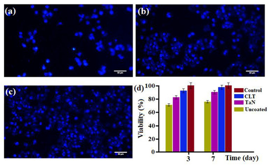 DAPI staining of MG63 osteoblasts cells on (a) Mg bare alloy, (b) TaN coated, (c) CLT coated, and (d) Cell viability of MG63 osteoblast cells after incubation in uncoated and coated Mg alloy specimens for 3 and 7 days.