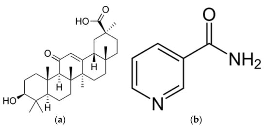 Molecular structure of (a) glycyrrhetic acid; (b) niacinamide.