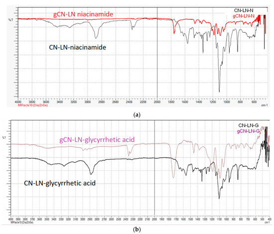The grafting was performed onto two different CN–LG systems: one containing glycyrrhetic acid [36] and the second with niacinamide (Figure 1). These two different trials were performed to consider the reliability of the polymerization despite of the different chemical structure of the functional molecule.