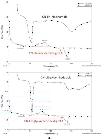 (a) Differential scanning calorimetry (DSC) thermogram of unmodified and modified chitin–lignin complexes by PLA grafting niacinamide complexes (b) glycyrrhetic acid.