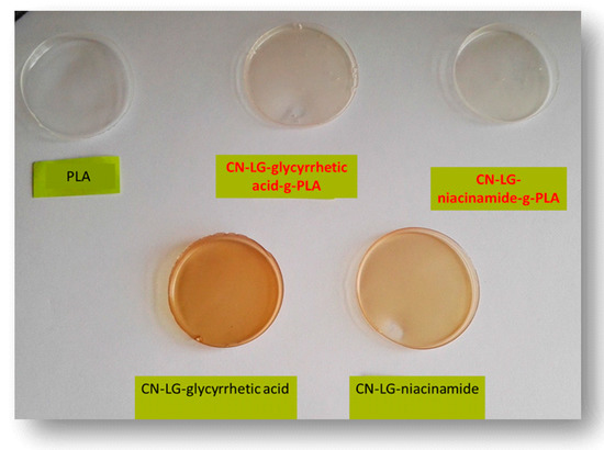 This paper represents an attempt to select simple methodologies for modifying PLA-based film surfaces by including anti-microbial and anti-oxidant complexes based on chitin nanofibrils and lignin containing glycyrrhetic acid. In slightly acidic water suspension, chitin nanofibrils are positive, whereas the lignin is negative, hence they form a chitin–lignin (CN–LG) complex eventually entrapping selected functional molecules. This complex became cytocompatible, showing anti-inflammatory activity, and may serve for the delivery of biomolecules for skin care and regeneration [29]. In the present paper, the complex containing niacinamide is also considered. Niacinamide anti-inflammatory properties make it an attractive treatment for skin conditions marked by inflammations [30].