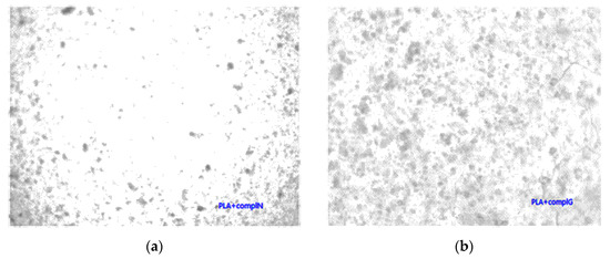 Micrographs (magnification 100×) of solution cast films of PLA with added (a) chitin–lignin complex with niacinamide and (b) chitin–lignin complex with glycyrrhetic acid.