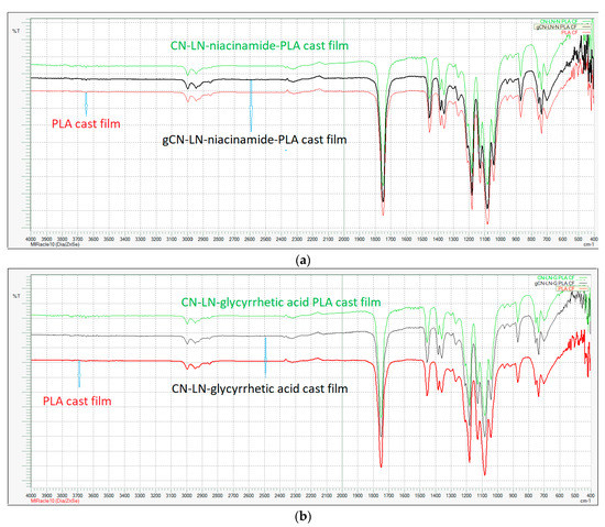 FTIR spectra of PLA cast films with (a) unmodified chitin–lignin complexes and (b) modified chitin–lignin complexes.