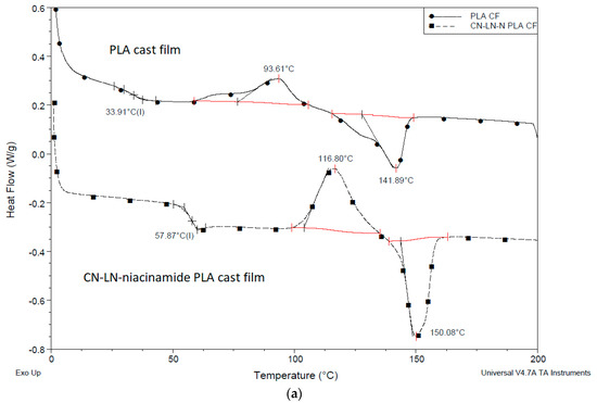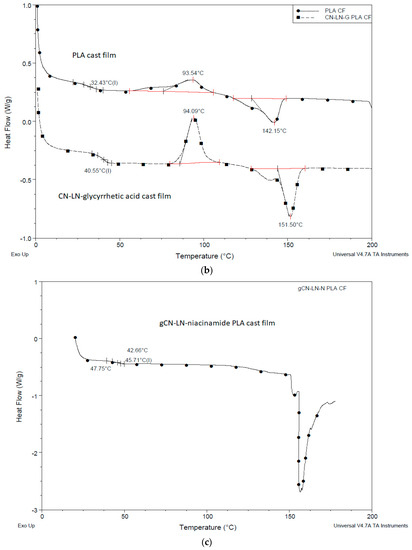 DSC thermograms of PLA films with unmodified chitin–lignin complexes, (Figure 7a and Figure 8b), showed the characteristic transition temperatures of PLA; a glass transition temperature at 57 °C and 40 °C, Tc at 116 °C and 94 °C and Tm at 150 °C for film with niacinamide and glycyrrhetic acid, respectively.