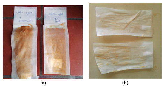 After this, extruded PLA films were coated with PLLA-based coating containing unmodified and surface modified chitin–lignin complex nanoparticles. As in the previous case, the difference in the color of the two films can be seen. While PLLA loaded with unmodified particles has a brownish color (Figure 8a), originating from the color of the complex, coating with modified particles has a lighter color (Figure 8b).