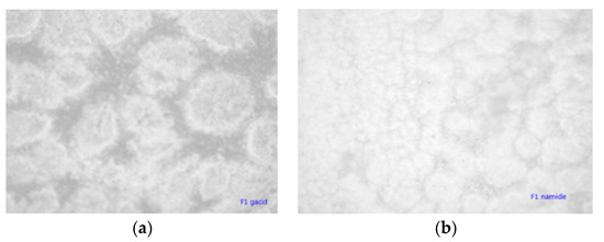 Micrographs (magnification 100×) of extruded film coated with PLLA-based coating with unmodified chitin–lignin complex loaded with, (a) glycyrrhetic acid (b) niacinamide.
