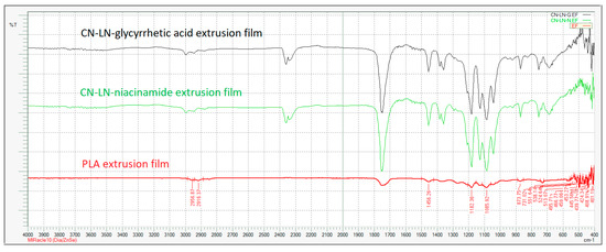 FTIR spectra of PLA extruded film coated unmodified chitin–lignin complex nanoparticles.