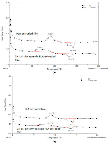 DSC thermogram extruded film coated with PLLA-based coating with (a) unmodified chitin–lignin niacinamide complexes and (b) unmodified chitin–lignin glycyrrhetic acid complexes.