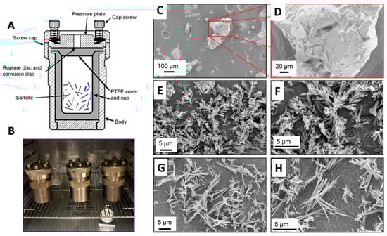 Hydrothermal processing of sol-gel derived tertiary bioactive glass. (A) Schematic drawing of a hydrothermal processing unit; (B) digital photograph of the hydrothermal units; (C,D) scanning electron microscopy (SEM) images of as-prepared bioactive glasses by the sol-gel process before hydrothermal processing; (E–H) representative SEM images of bioactive glasses after 36 h hydrothermal processing at 130 °C (E,F), and at 170 °C (G,H).