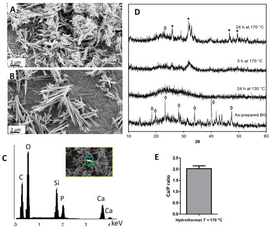 The effect of hydrothermal processing time on the morphological evolution of bioactive glass (BG). (A) 170 °C for 3 h and (B) 170 °C for 24 h. (C) EDX spectra of nanorods prepared at 170 °C for 24 h. The region shown by the green square in the inset in Figure C was used to generate the EDX spectra. (D) XRD patterns of as-prepared and hydrothermally-processed BG; (•) indicates hydroxyapatite and (◊) SiO2. (E) Ca/P ratio of nanorods prepared at 170 °C for 24 h.