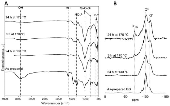 Figure 3B displays the 29Si-NMR spectra of the sol-gel-derived and hydrothermally-processed BG particles. All the specimens, before and after hydrothermal processing, exhibited dominant Q3 and Q4 species. Qn corresponds to the structures of Si-O-Si(OSi-)n(OH)4-n, where OH is referred to as non-bridging oxygens. Chemical shifts at approximately −100 and −110 ppm are associated with Q3 and Q4 species, respectively. In addition to Q3 and Q4 structures, there were peaks observed at −73 ppm for BGs processed at 170 °C, which are associated with Q1Ca structures (Si-O-Si networks containing three bridging oxygens in which one of the H was replaced by calcium (-Si-O-Ca)) [,,]. It has been previously reported that BGs are required to be heated to a temperature greater than 400 °C to incorporate Ca into the glass networks []. In this study, we found that a weak peak was visible for Q1Ca following 3 h of hydrothermal processing at 170 °C. Furthermore, a strong peak for Q1Ca was visible after heat treatment for 24 h. This finding suggests that the hydrothermal conditions enhanced the formation of calcium incorporated into the glass network.