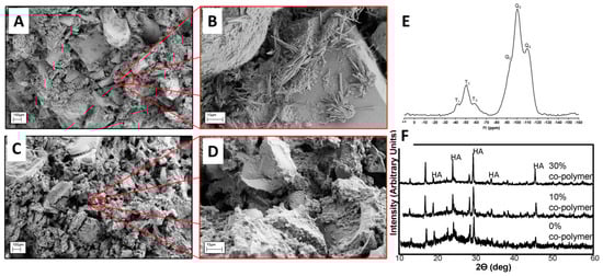 SEM images of composites consisting of hydrothermally-treated (at 170 °C for 24 h) BG nanorods without a co-polymer (A,B) and composites made of hydrothermally-treated (at 170 °C for 24 h) BG nanorods with a co-polymer (C,D). Solid-state Si-NMR of hydrothermally treated bioactive glass composites (E) and XRD profiles of the bioactive composites showed HA formation (F).