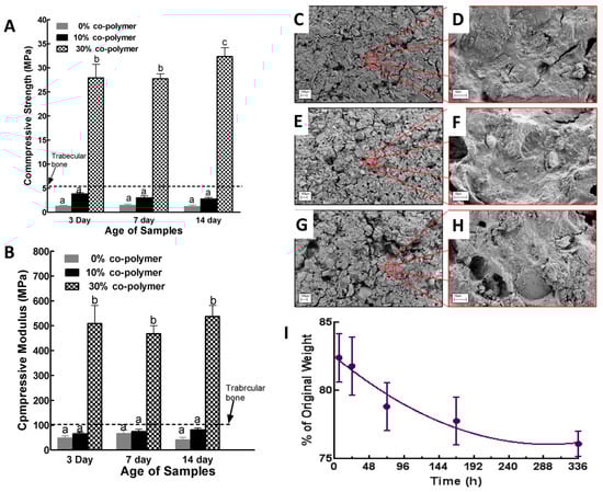 Composites with covalent crosslinking between polymers and BGs are known to provide better mechanical properties and more controlled degradation behavior when compared to conventional composites without strong interaction within the different phases []. In this study, the addition of 10% co-polymer did not affect the compressive strength and modulus significantly compared to the composite made without co-polymer. However, the addition of 30% co-polymer resulted in an increase in the strength and modulus values significantly (p < 0.01; Figure 5A,B). These co-polymers used in the present study had pendant trialkoxysilane functional groups as side chains, which provided a much higher number of reactive sites to BG nanorods during composite formation. Incorporation of a higher amount of co-polymer increased the degree of crosslinking, which enhanced the mechanical properties of the composites. The compressive mechanical properties data were consistent with the solid-state Si-NMR results.