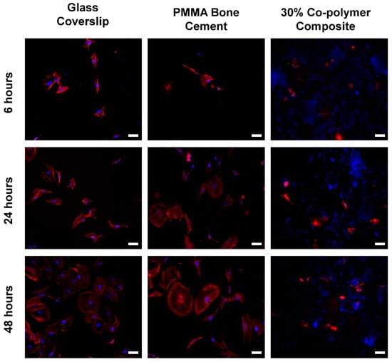 Cell culture was conducted by seeding MC3T3-E1 pre-osteoblastic cells (Subclone 4, American Type Culture Collection, Manassas, VA, USA) onto control glass slides, polymethylmethacrylate (PMMA) controls and composite disks. MC3T3-E1 cells were cultured in standard tissue culture plates using α-MEM supplemented with 10% fetal bovine serum (FBS) and 1% antibiotic–antimycotic solution. The medium was changed every 2 days and cells were removed from the plates using trypsin–ethylenediaminetetraacetic acid solution. The hardened composite loaded into a 3 mL syringe was cut using a diamond blade into 9 disk specimens of 6 mm in diameter and 1.5 mm in height. Disks were incubated in media solution for 1 week to make sure that the pH was 7.4 prior to cell seeding. All disks were disinfected by submerging them into 70 vol % ethanol for 1 h and dried. Prior to seeding the cells, each disk was incubated in 1 mL serum-free culture medium. The disks were transferred to 48 well plates and MC3T3-E1 pre-osteoblastic cells were seeded at a density of 10,000 cells/well and incubated for 6 h, 7 days and 14 days. The culture medium was changed every 2 days. Specimens were fixed at 6, 24 and 48 h from seeding and subsequently blocked and stained with phalloidin for F-actin and 4′,6-diamidino-2-phenylindole (DAPI) for nuclei.