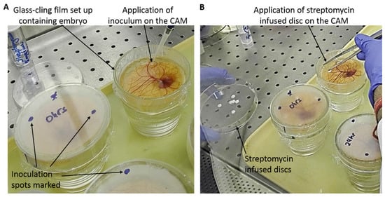 The extraembryonic chorioallantoic membrane (CAM) of the chick embryo is easily accessible, highly vascularised, and presents an immunodeficient environment []. Therefore, it has been widely used in various aspects of research such as biology, pharmacy, oncology, and tissue regeneration [,]. It has also been used as an ex vivo model to study pathogenesis and the invasion capacity of different bacteria such as Klebsiella pneumoniae, fungi such as Cryptococcus gatii or Candida albicans, and viruses such as the fowlpox-causing viruses [,,,]. In these studies, the CAM was inoculated with the pathogen of interest, and after subsequent infection, the researchers assessed the survival and morphological features of the CAM and embryo. Thus far, only in ovo systems have been used. However, ex ovo systems may offer advantages over in ovo systems. Although in ovo CAM assays are very popular, a significant variation exists in in ovo techniques as a result of a lack of standardisation. Furthermore, in ovo systems often develop contamination from the eggshell dust, and therefore are inefficient in maintaining sterility of the embryo []. Recently, research into ex ovo techniques has seen the development of efficient, reproducible, and cost-effective CAM assays that are becoming increasingly popular in the fields of biomaterials and tissue engineering [].
