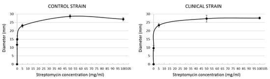 An assay to determine the streptomycin concentration that yielded the desired level of bactericidal effect was carried out, where S. aureus was tested against several concentrations of streptomycin using the standard EUCAST disc diffusion method []. S. aureus from both a clinical strain and a control antibiotic susceptible strain were used. Results showed that the minimum streptomycin concentration necessary to yield a noticeable bactericidal effect on both strains tested was 5 mg/mL. Below this concentration, the bactericidal effect was faint, whereas above it the effect was hardly enhanced (Figure 2). Therefore, 5 mg/mL was chosen to carry out our study.