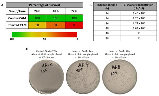(A) Percentage of embryo survival after CAM infection (infected CAM) with 105 cfu/mL inoculum compared to non-infected CAMs (control CAM). Results show average (n = 3 for control and n = 6 for infected CAM at the beginning of the experiment). (B) S. aureus load in allantoic fluid samples of infected CAMs. X means that there were too many colonies and a count could not be performed. (C) Representative images of Luria-Bertani (LB) plates showing S. aureus colony formation after plating samples of the allantoic fluid from control and infected CAMs.